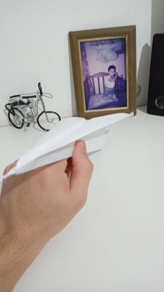 Utilizando uma folha de papel sulfite A4, fizemos a dobradura do avião. Sendo assim, o tal foi testado e ficou no ar por 3 segundos.
